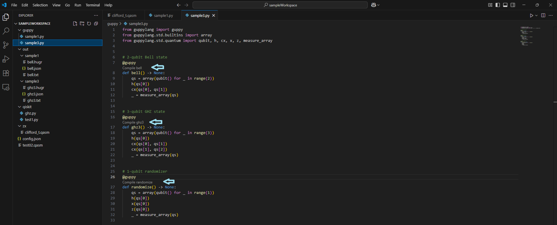 When you open guppy-python code with @guppy definition of function, extension detects it and “Compile <funcName>” appreas directly in editor