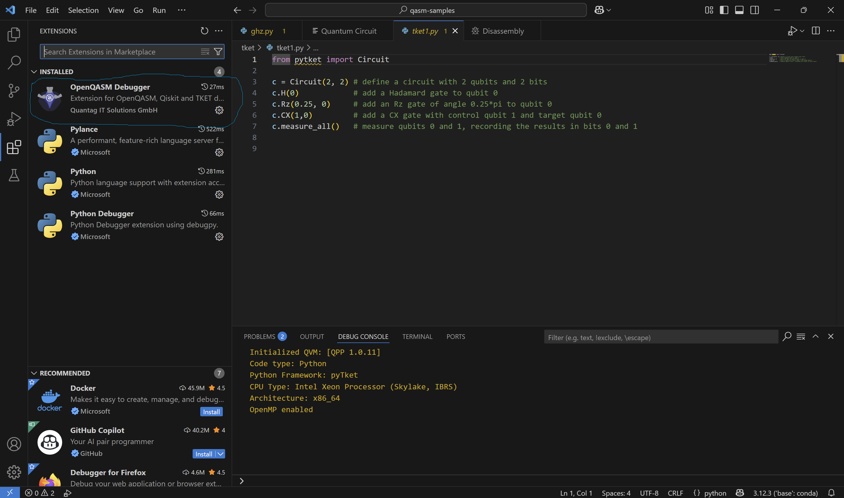 Installation for VS Code¶ Install extension from marketplace Here Or directly from VS Code. Search for “OpenQASM Debugger”