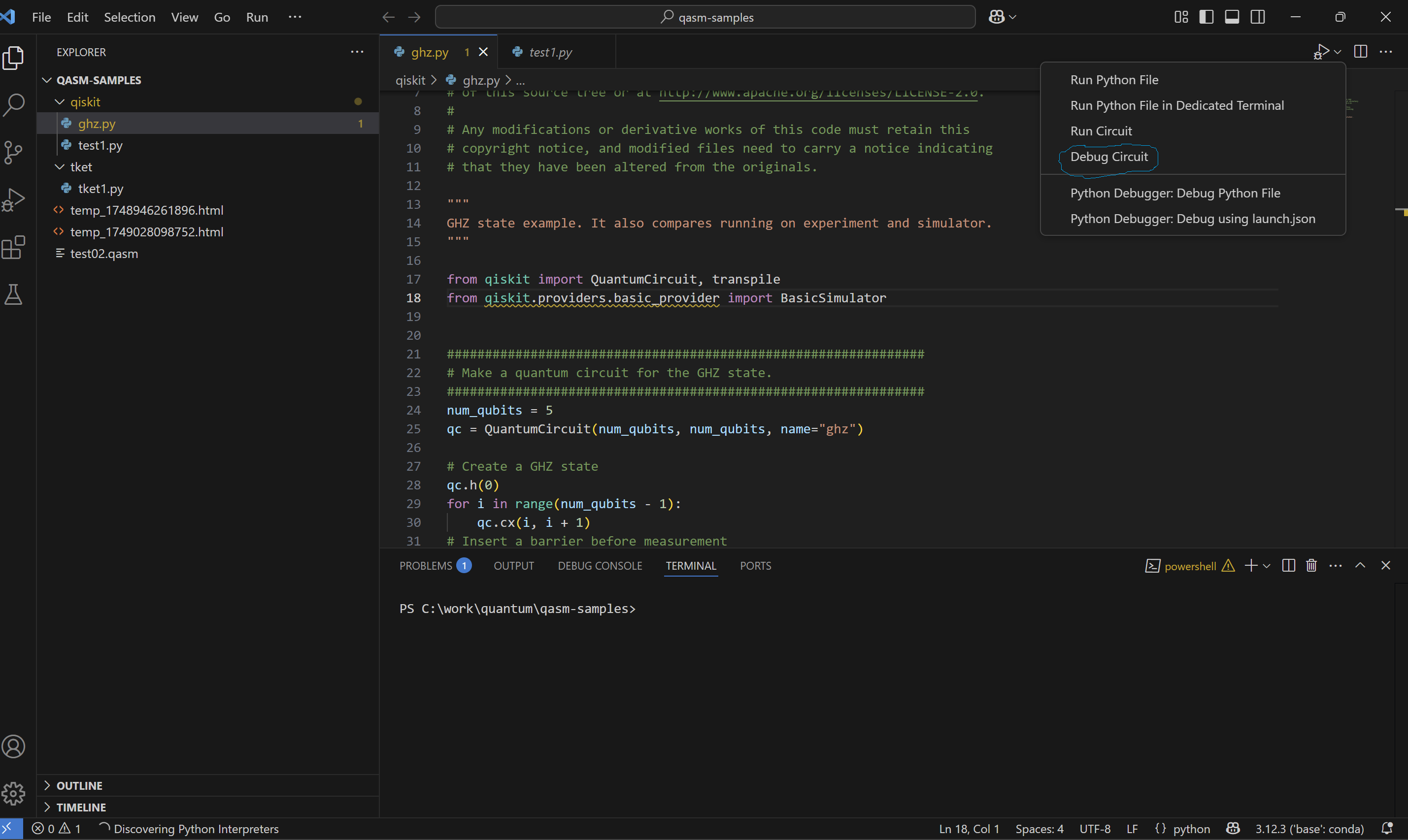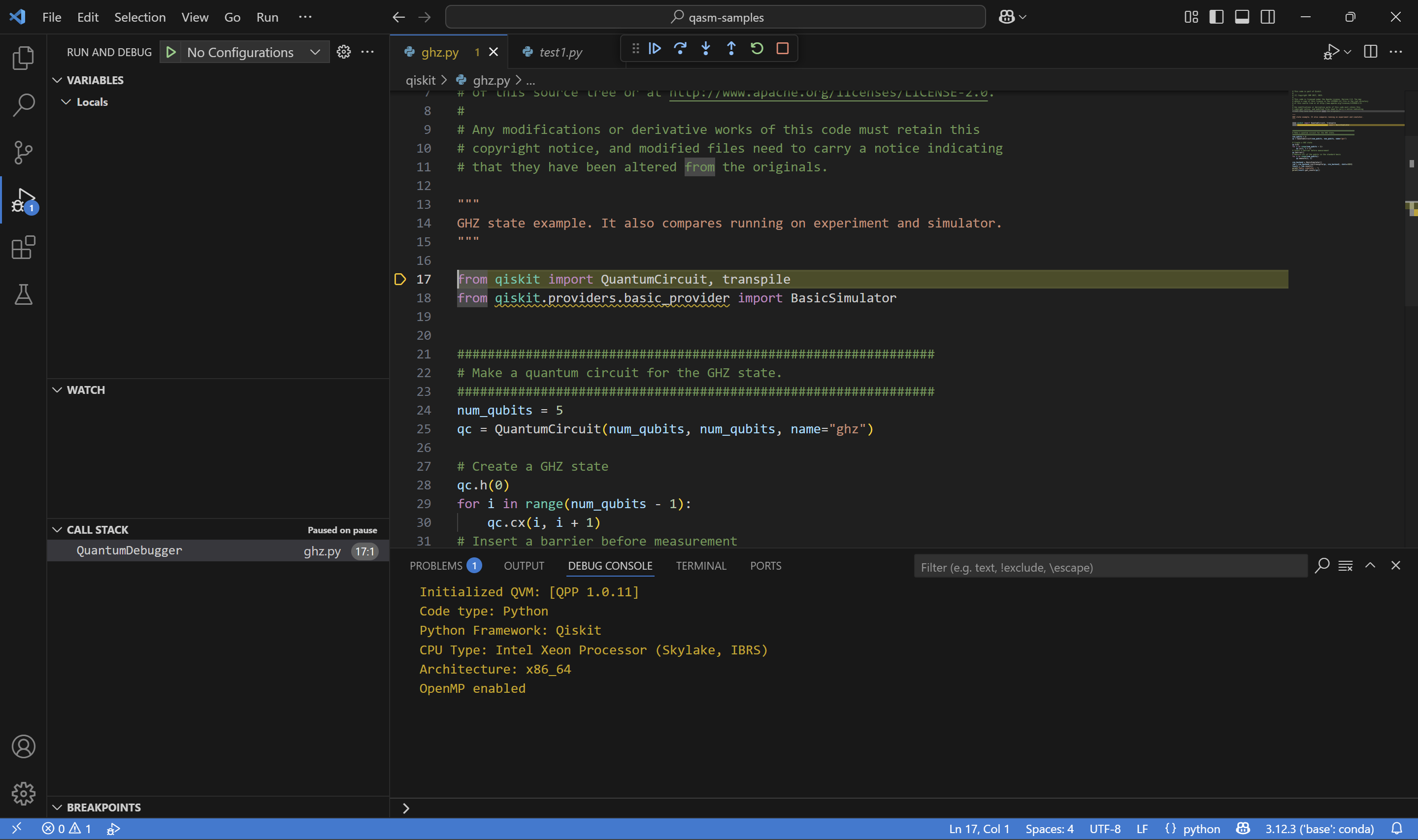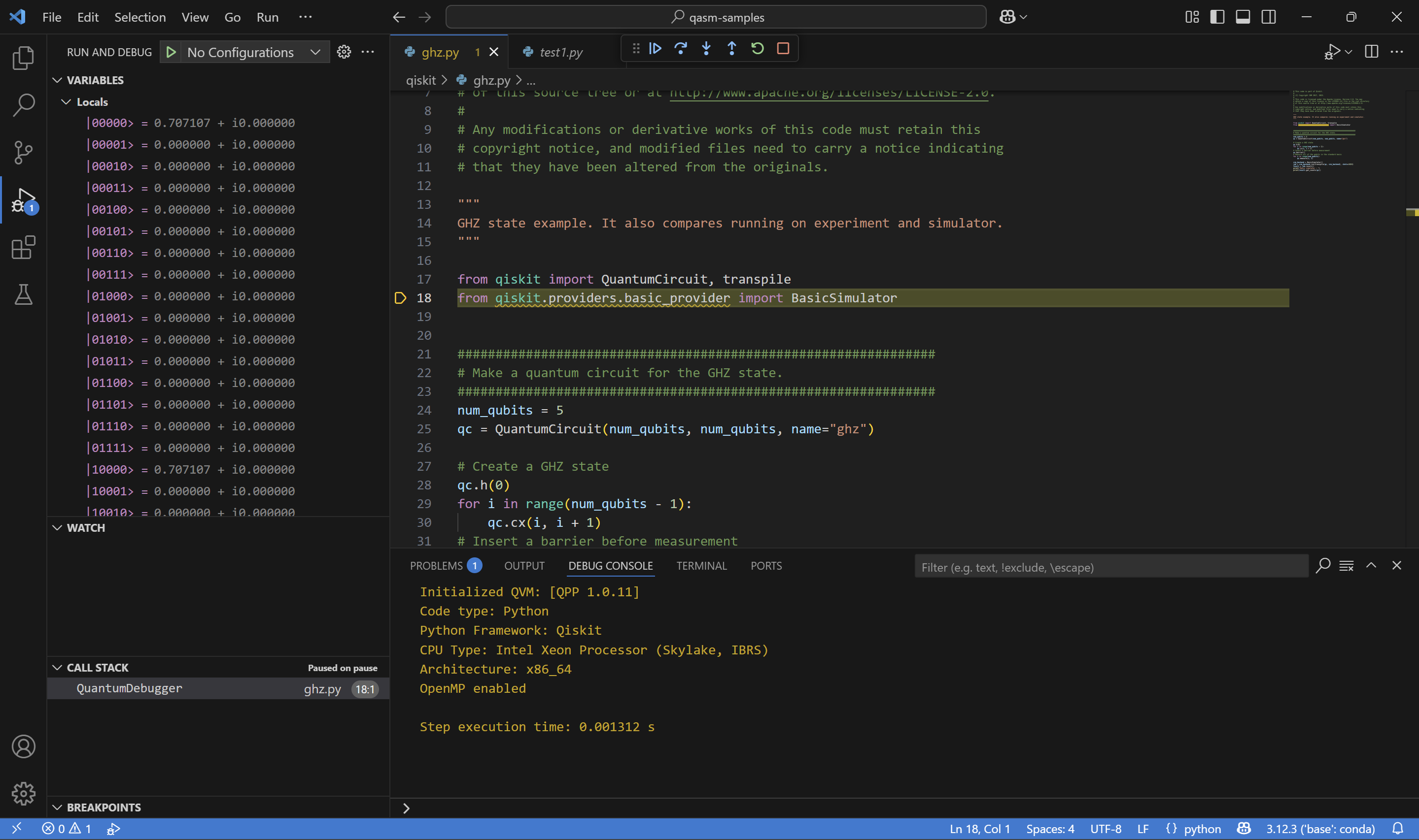 Pressing Step Over (F10) will execute first command and quantum state of QVM will be shown in Variables tab