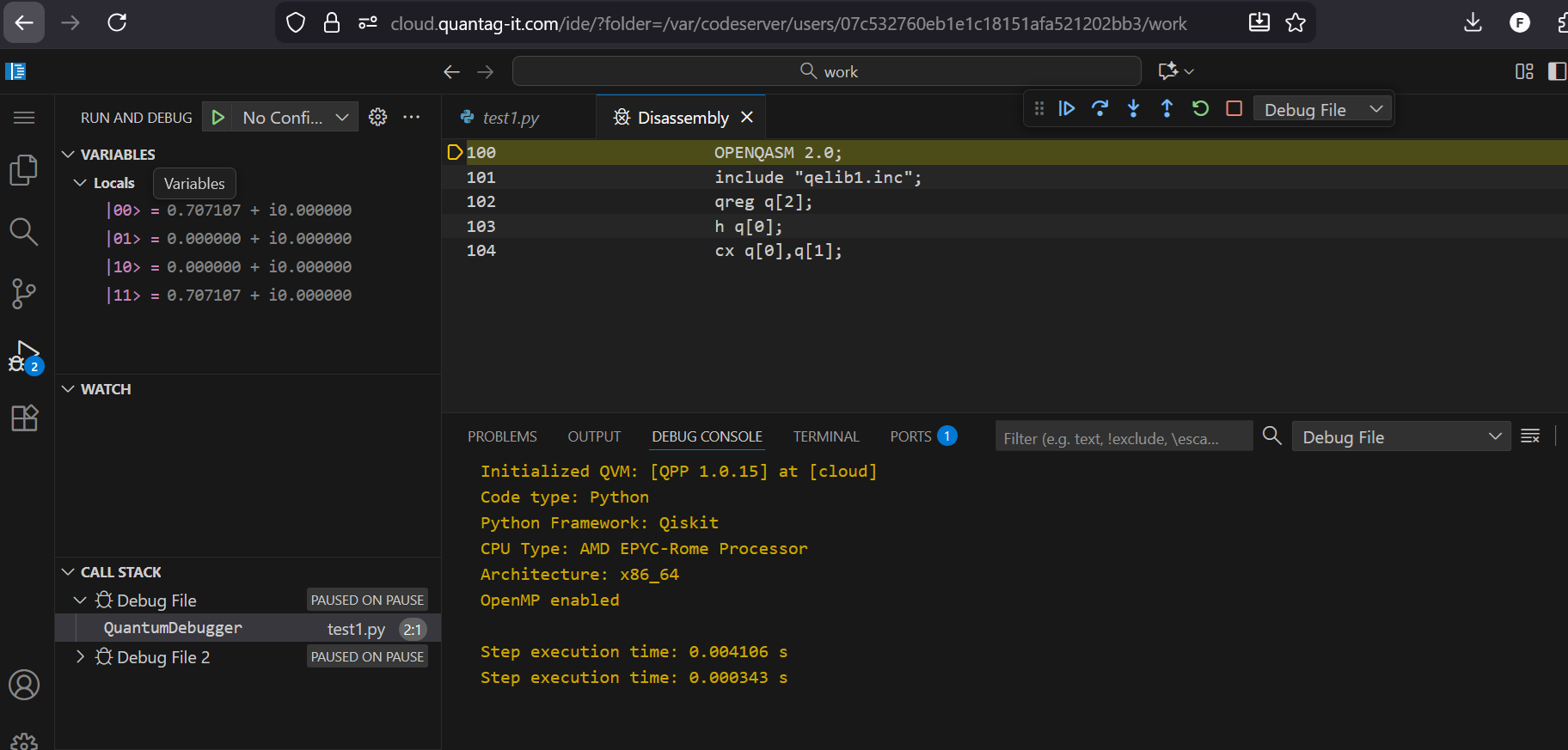After that you will be able to debug and run python scripts and see disassembled OpenQASM code in Disassembly view