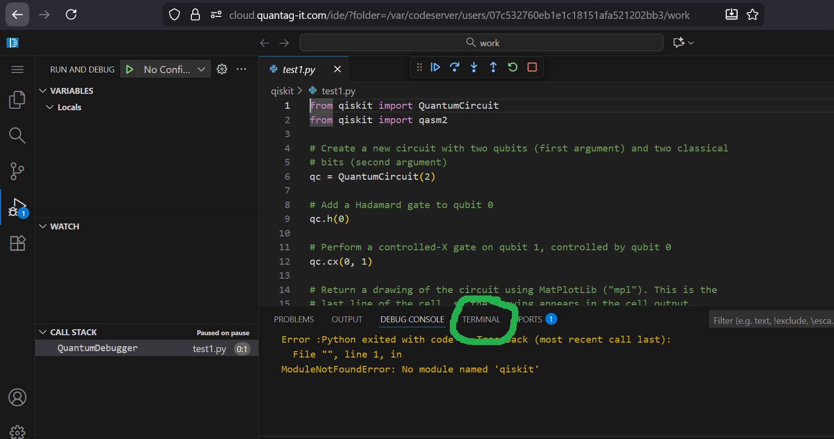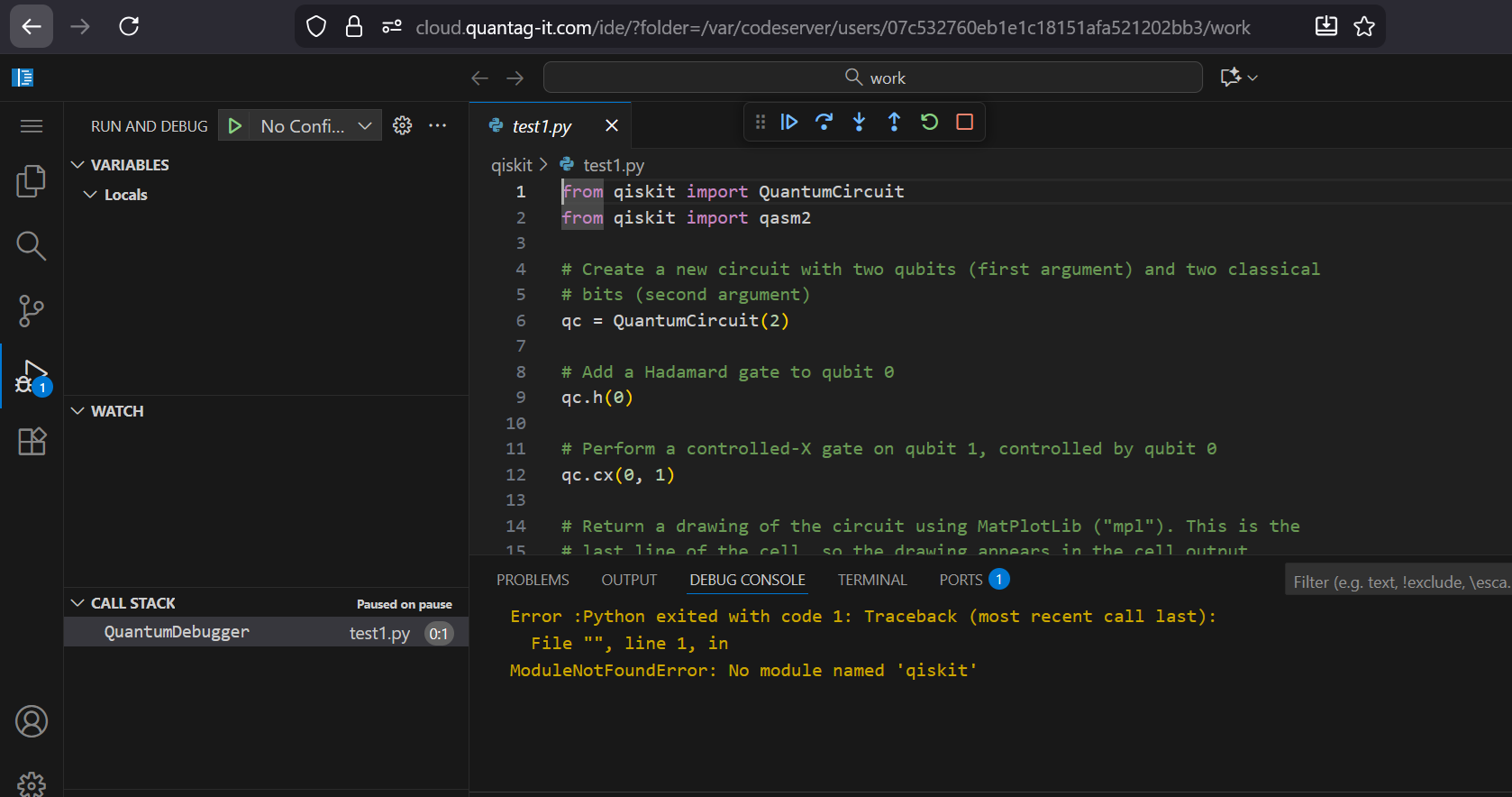 If you will try to Debug or Run python circuit which uses qiskit, you will see error like that: