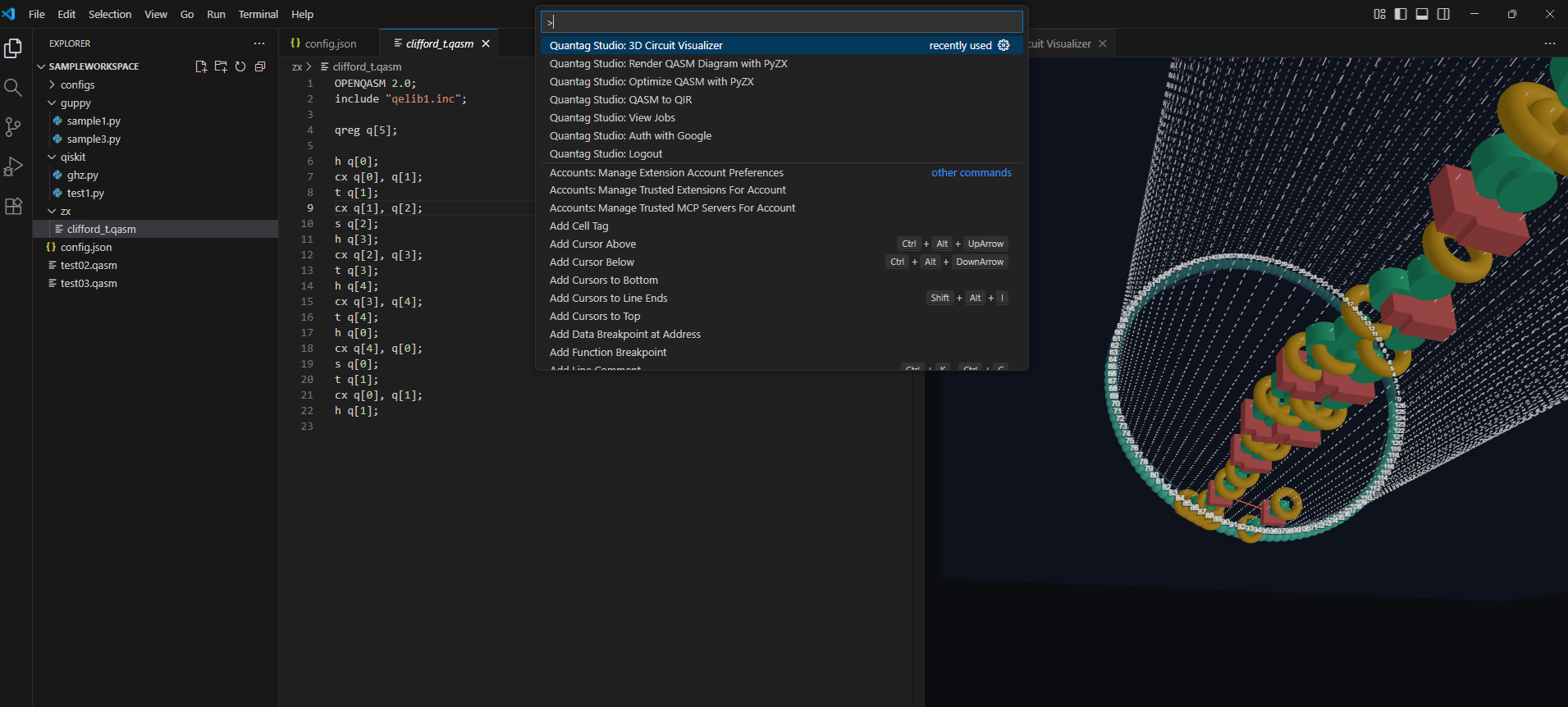 You can open 3D view also directly from VS Code (only OpenQASM file). Choose command “Quantag Studio: 3D Circuit Visualizer” from Command Palette