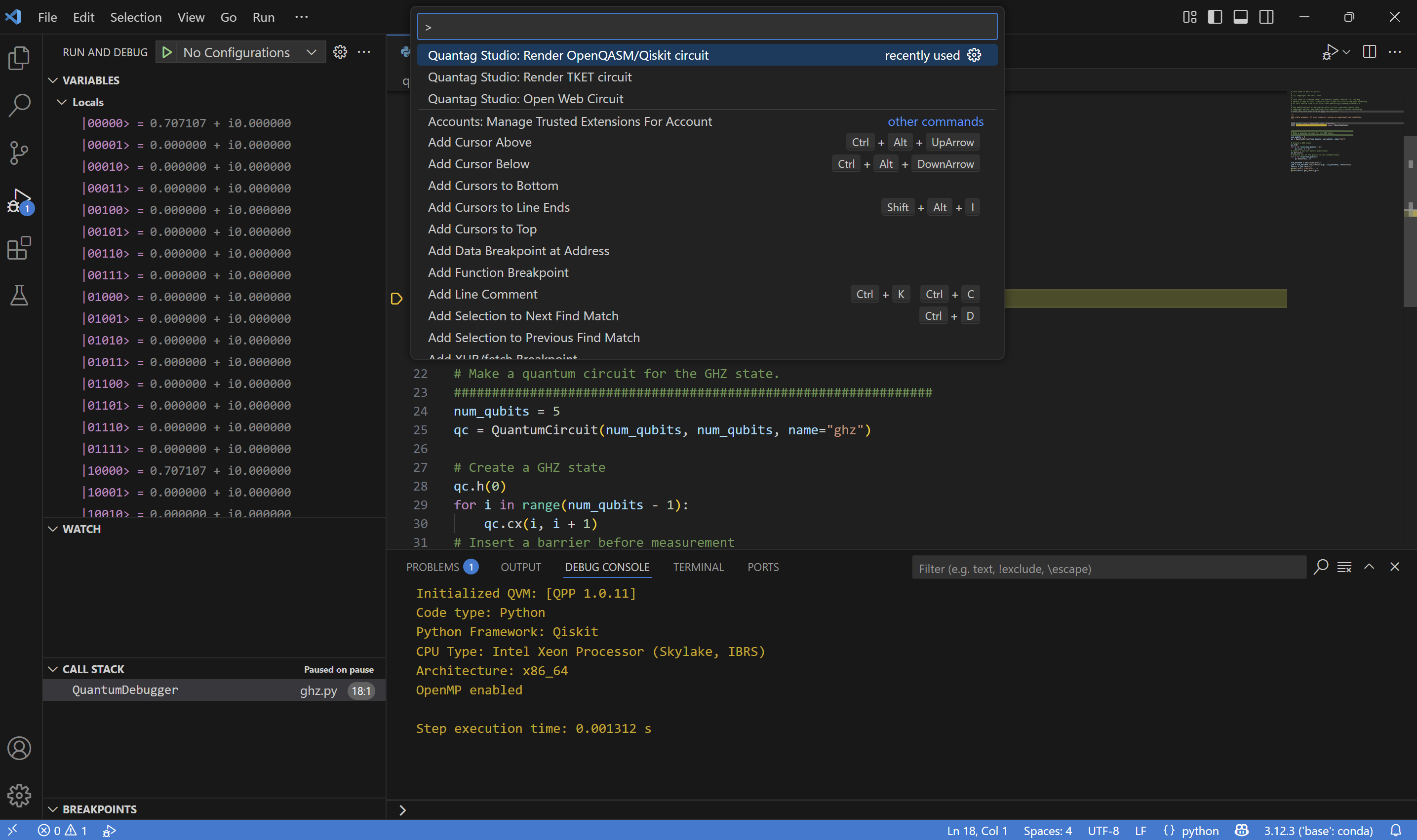 To visualize OpenQASM or Qiskit circuit open Command Pallete.. in menu View and find command “Quantag Studio: Render OpenQASM/Qiskit circuit”