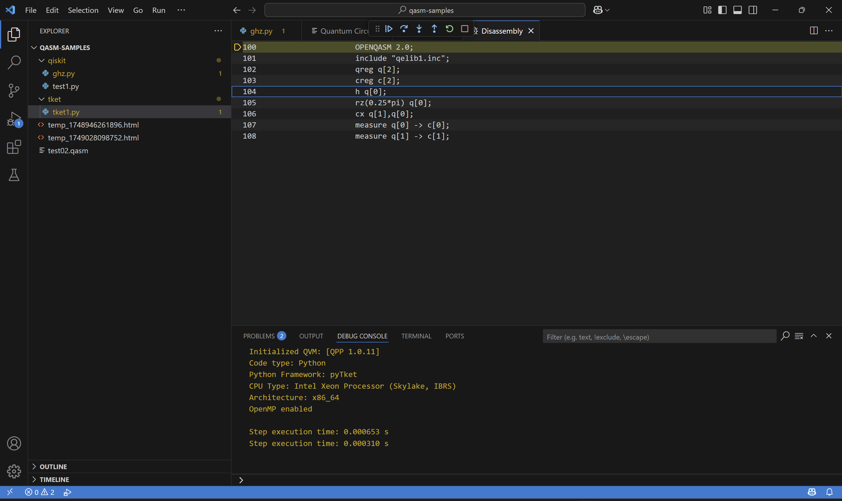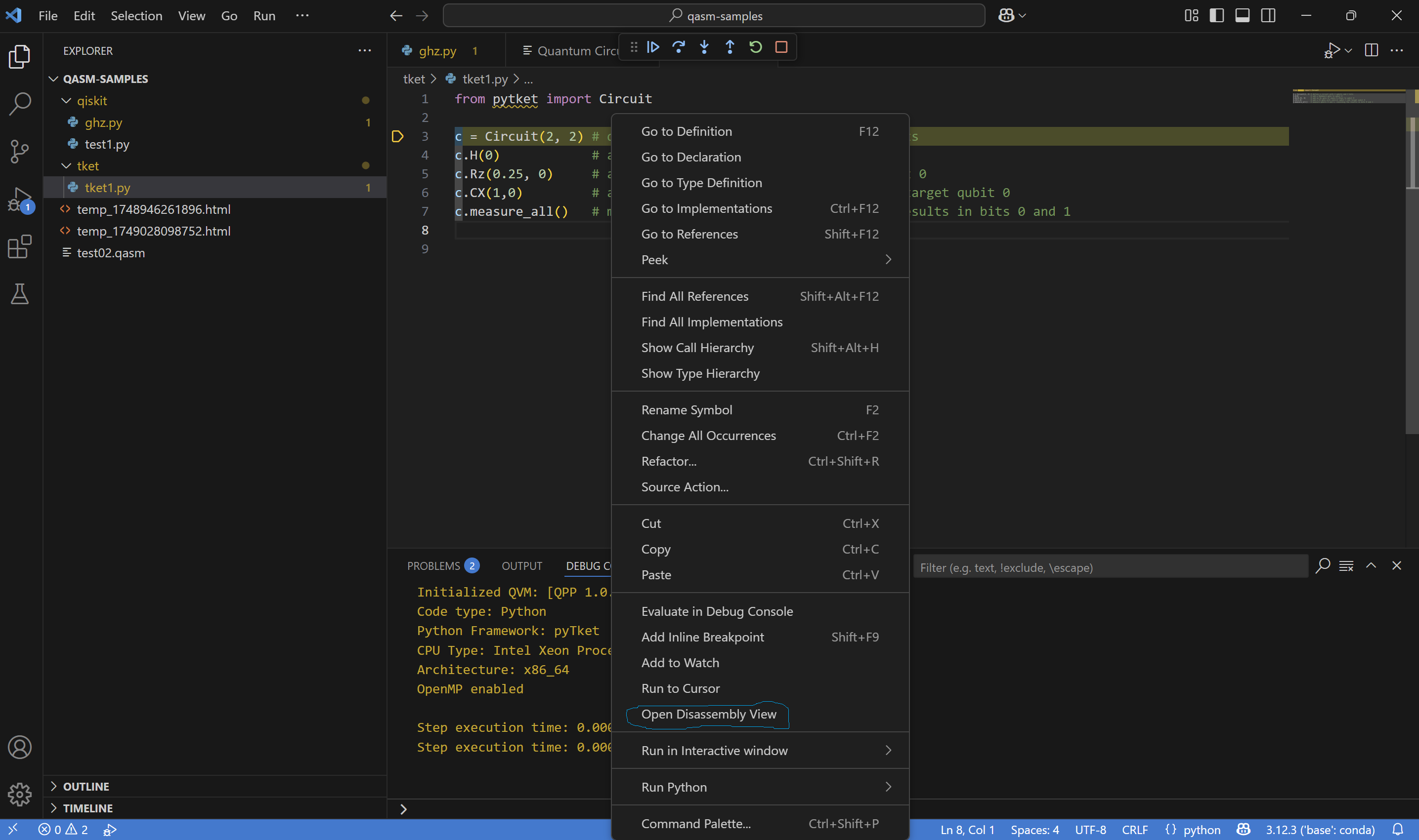 To see OpenQASM code from python script - during debugging session right click on source code and choose “Open Disassemply View”.